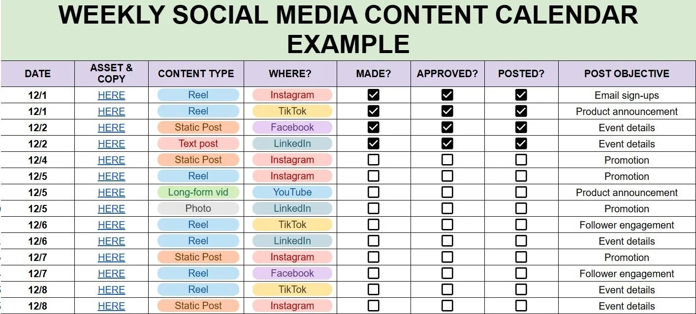 First, we’d have a discovery call to chat through your goals. Once we establish your brand and nail down your ideas, I’ll start building a content calendar to accomodate your needs. I’ll cover all your bases: Instagram, Facebook, TikTok, LinkedIn, and YouTube.